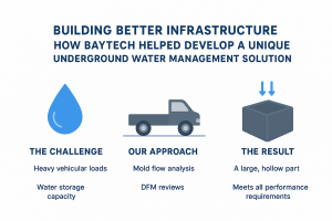 At Baytech, we pride ourselves on solving complex molding challenges that others won’t touch. One standout example is our work on a unique underground stormwater storage module designed to sit beneath roads and pavements.